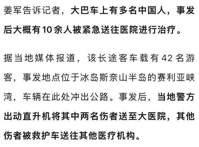 10月6日,冰岛一辆大巴车在行驶途中侧翻,车内载有多名中国乘客。7日下昼,亲历该事件的中国乘客姜军(假名)告诉极目新闻记者,事发时,大巴从公路上冲出,侧翻在地,导致多东谈主受伤。他我方因背部受伤,现在无法迁移,伏击需要营救。