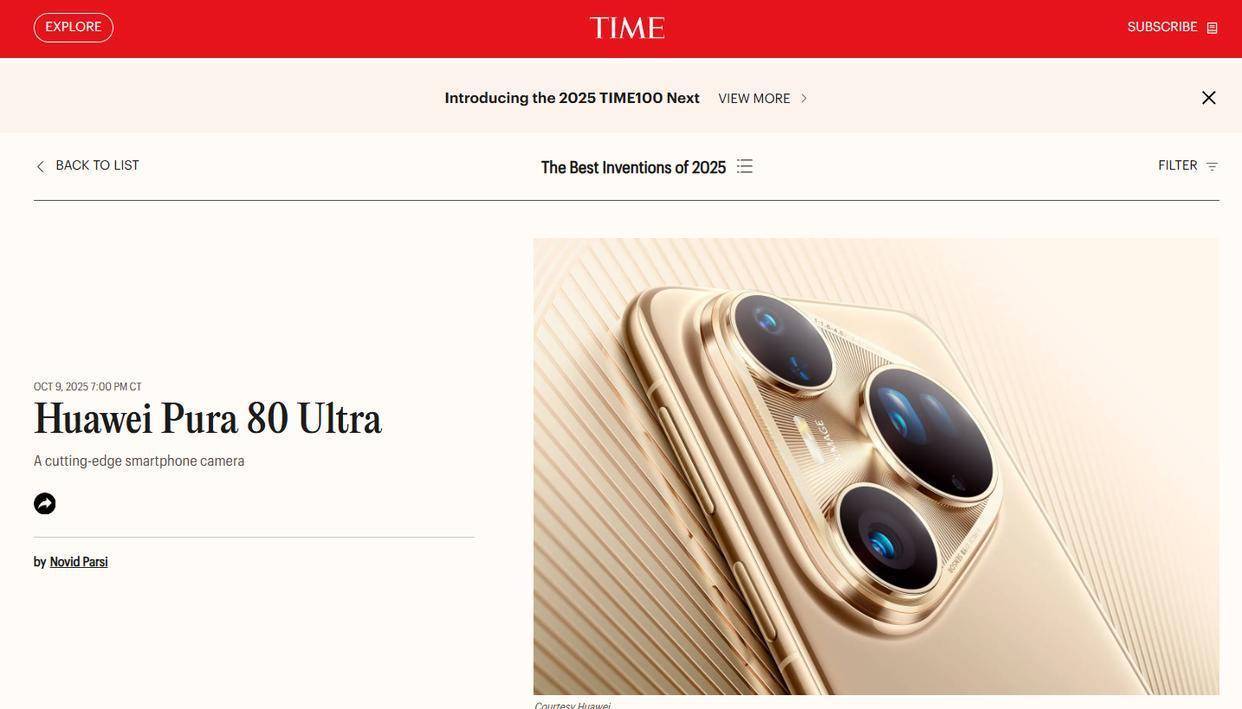 此次《时期》公布的发明榜单里,华为 Pura 80 Ultra 手机和苹果 AirPods Pro 3 耳机都上榜了。