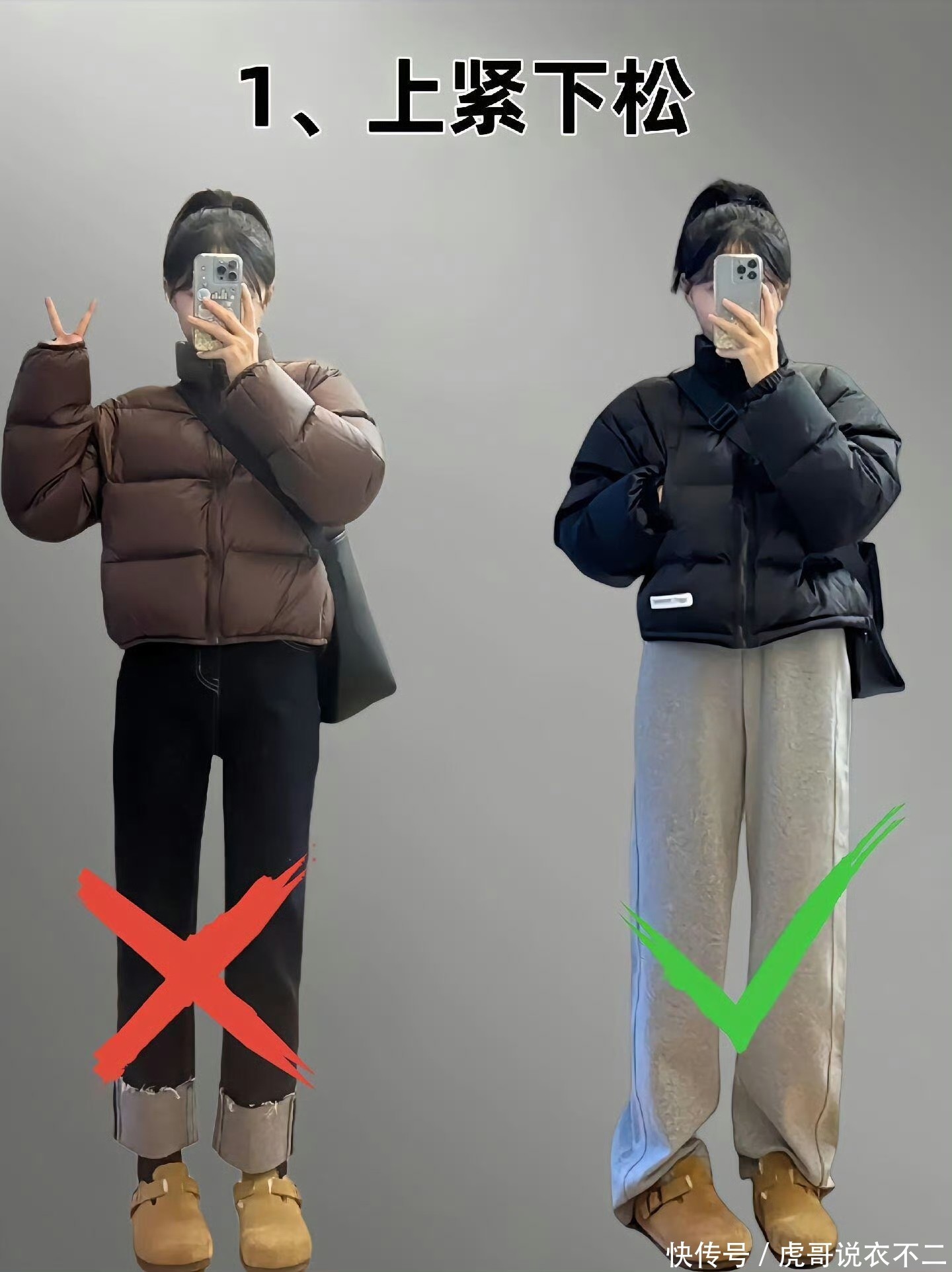 正确的穿搭案例是短款羽绒服+阔腿裤,要是是微喇的拖地款裤型扫尾会更好,短款羽绒服+拖地款,视觉上会让腰线位置更高,躯壳比例也更好,从而达到拉长体态,小个子也能穿出高个子的气场。