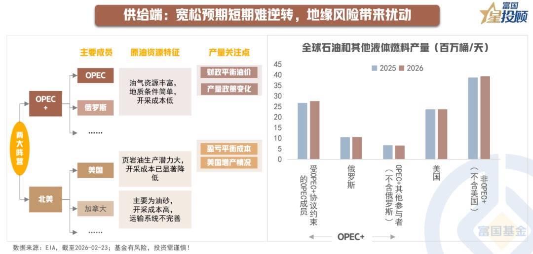 从整形体局看,好意思国、沙特阿拉伯、俄罗斯是寰球原油市集的三大主要玩家,也组成了现阶段原油供给端的两大阵营——OPEC+与北好意思阵营。天然OPEC+晓示在一季度暂停增产,但其在2025年的累计增产已特地权贵,非OPEC+方面,好意思国增长或有放缓但仍将守护高位,巴西和圭亚那等南好意思地区新神志投产较多。轮廓来看,2026年供应端的“宽松预期”将抓续存在。EIA预计2026年寰球石油供应将加多156万桶/天至1.079亿桶/天,寰球石油和其他液体燃料破钞量将加多120万桶/天至1.048亿桶/天,即寰球原油约有310万桶/天的供应多余。不外,地缘政事风险仍将对2026年供需均衡酿成伏击影响,因此供给端预期仍有较大波动。