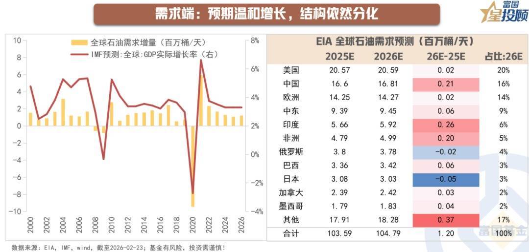 2025年好意思国“平等关税”政策的反复滋扰寰球经济增长,株连石油需求。左证IMF最新《宇宙经济瞻望阐明》,2026年寰球经济增长率预测上调至3.3%,经济复苏有望带动原油需求回暖。不外好意思国关税政策的不笃定性仍会组成下行风险,同期在寰球经济复苏节律分化、主要经济体通胀压力仍存的布景下,油价进步较高终将反向扼制石油破钞需求。左证EIA好意思国动力署最新预测,2026年寰球石油需求增长相对温顺且面对结构性分化,2026年寰球石油和其他液体燃料破钞量将加多120万桶/天,结构上与2025年情况调换,需求增量基本自非经合组织经济体,其中中国、印度领跑,发达经济体的石油需求增量则略显平常。