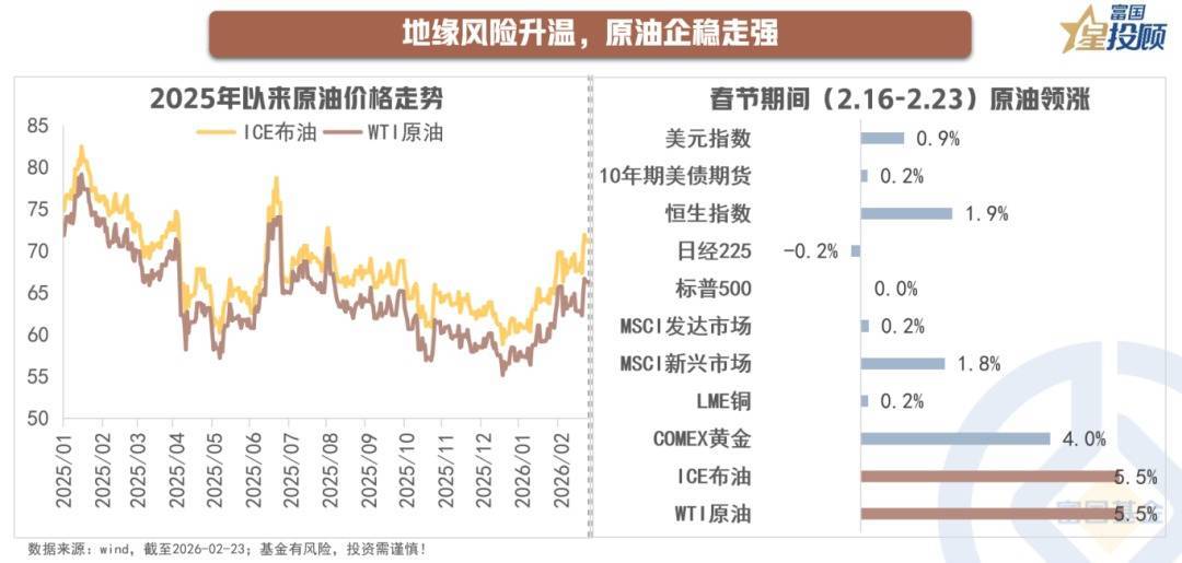 2025年,在供应预期宽松、需求增长乏力、库存高位和局部地缘政事事件催化的布景下,寰球原油期货市鸠合座呈现宽幅震撼、阶段性下行的方式。12月中旬以来,由于需求端季节性增长、天气事件滋扰寰球原油供应,加之中东地缘垂危形势升温等,原油市集呈现"V型"反弹。春节前一周,跟着中东地缘风险逐渐降温,类似北半球冬季取暖需求旺季趋于尾声,原油期货价钱再度劣势下行。而春节时代,由于国际市集关于好意思国与伊朗开战的预期快速飞腾,国际油价显着走高,并领跑各样钞票。为止2026年2月23日,布伦特原油期货价钱已破损70好意思元/桶,WTI原油期货价钱则升至65好意思元/桶以上,创下近半年新高。