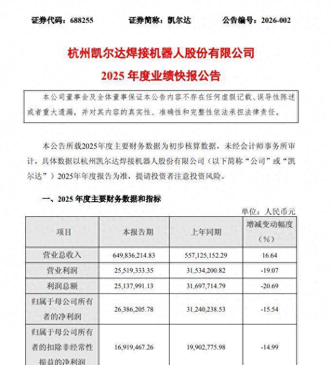 2月26日,杭州凯尔达焊合机器东说念主股份有限公司(688255.SH)发布2025年度事迹快报。敷陈期内,公司达成生意收入6.50亿元,同比增长16.64%;但受商场竞争加重及用度增长影响,归母净利润2638.62万元,同比下跌15.54%。