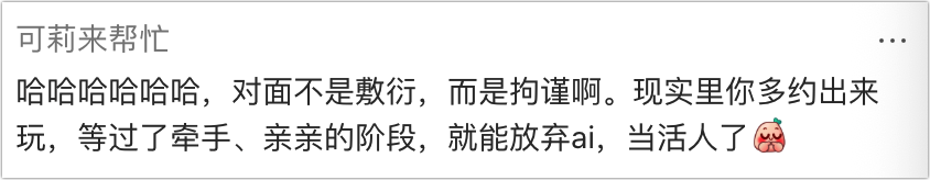更有东说念主给出骨子性冷漠:说对面不是拖沓,是抑止,冷漠多碰头聊,缓缓就废弃AI了👇🏻: